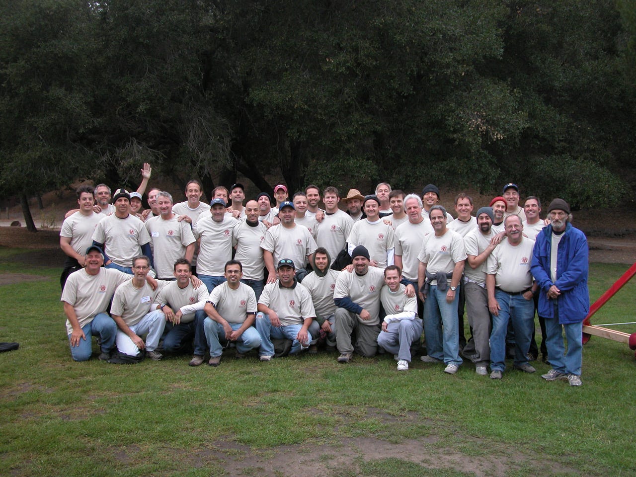 A bunch of white men in the woods in California.